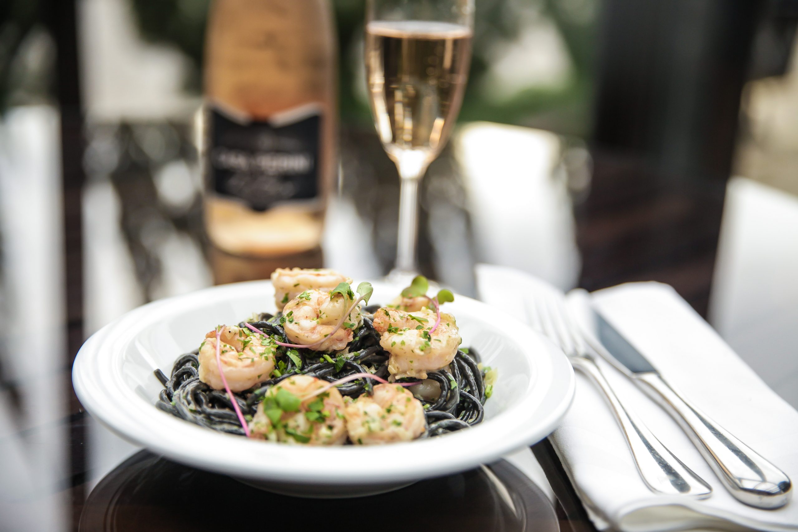 Casa Perini Music Day: uma experiência inédita na Serra Gaúcha spaghetti nero com molho de camaroes e espumante Casa Perini