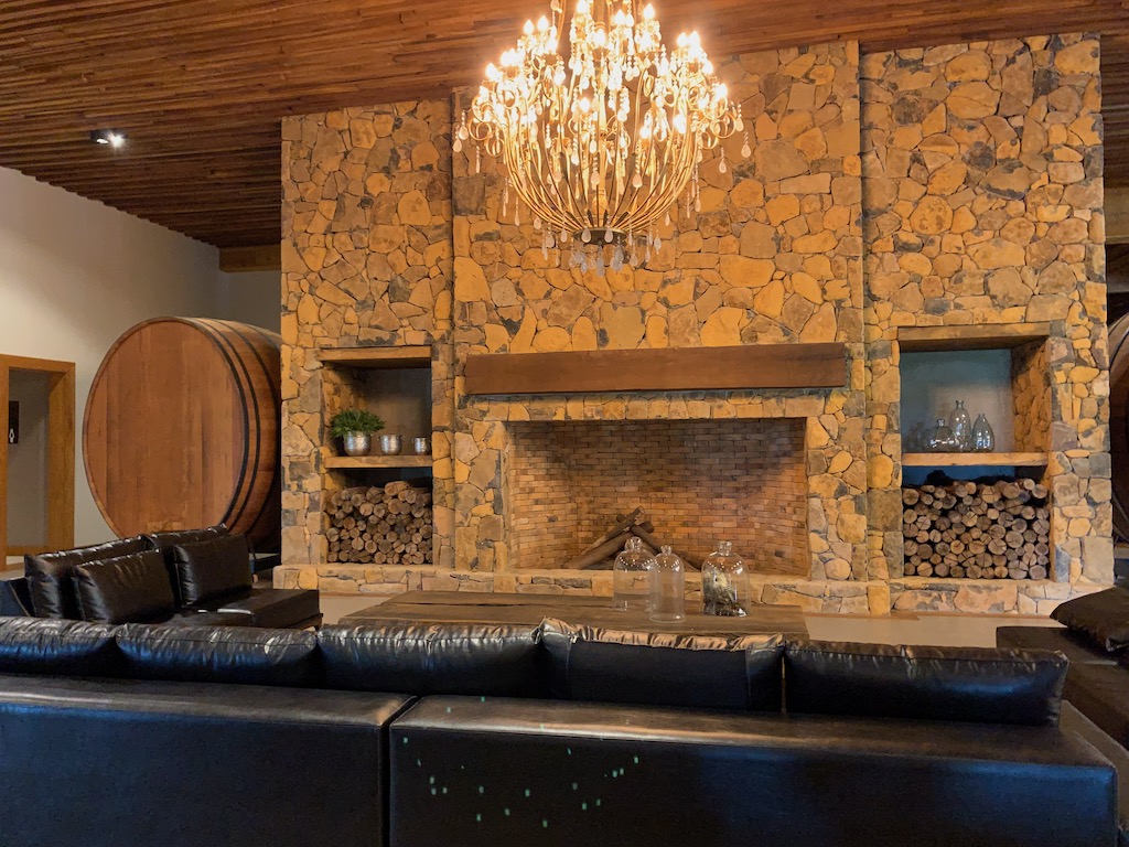 Por lá o grande diferencial é a estrutura da empresa, que conta com área de vinhedos para visita, salão equipado com lareira (e um lustre maravilhoso!!), área de eventos e lindas caves.